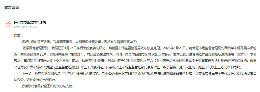 据答复称,根据属地办理准绳,怀化市市场监视办理局已于1月27日将相关线索转交怀化市鹤城区市场监视办理局依法核查处置。2026年1月29日,鹤城区市场监视办理局对西坐菜市场开展专项查抄,共查抄运营户25户,均已现场整改完毕。同时,怀化市市场监视办理局向全市各县市区局下发工做提醒,要求敏捷开展食用农产物运营场合违规利用“生鲜灯”专项整治,沉点对食用农产物集中买卖市场、商场、超市等进行放哨,对食用农产物发卖者利用不合适《食用农产物市场发卖质量平安监视办理法子》的照明设备的,根据《食用农产物市场发卖质量平安监视办理法子》第三十八条,由县级以上市场监视办理部分责令更正,赐与;拒不更正的,处五千元以上三万元以下罚款。下一步,怀化市市场监视办理局将继续加强对“生鲜灯”利用行为的监管,督促各类食用农产物运营场合严酷恪守法令律例和食物平安尺度,切实落实食物平安从体义务,保障消费者权益,优良的市场次序。
